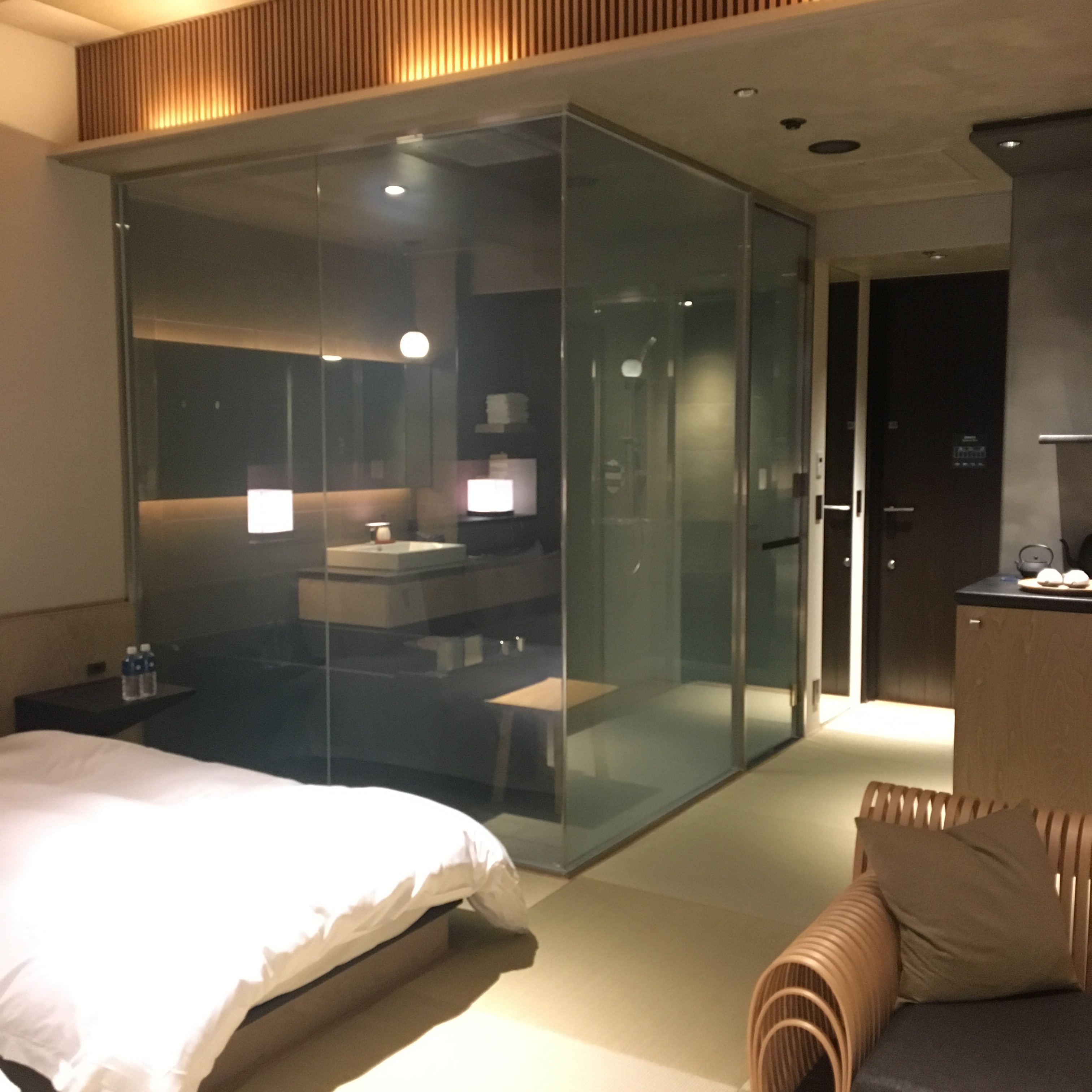Arrival is a novelty and somewhat disorienting affair as the doorman checks you against the guest list and scattered fellow guests squat awkwardly to remove their shoes all the while being handed over to another receptionist to escort you up to your floor. There’s no checkin (although there’s checkout and the entire 2nd floor is dedicated to that 5min activity). My fellow guests arrived after an intercontinental overnight flight and was told to wait for proper checkin time at 2pm and were driven out to the January mean streets. Rule-based Japanese service precisely applied to $1,000 per night spending guests.