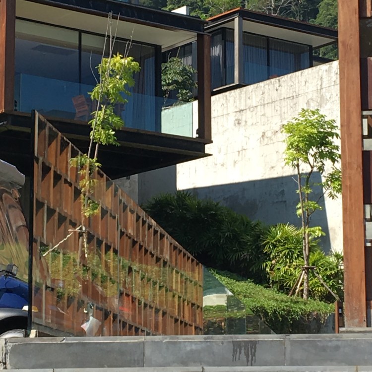 What adds to the intrigue of these minimal, modernist structures is the abundant natural elements blended in. Unobstructed views of Patong bay, rocky sand banks fronting the communal infinity pool and the lush green you’d expect from the hills of Kamala. But it not just raw nature that blends itself into the modernist villas: it is the natural materials incorporated into design. Perhaps it is the inexperienced local contractors who underappreciated the harsh Phuket elements in the vast sprawling hotel such as this – natural teak with light maroon patina is ageing rapidly yet masterfully. Teak flooring in the villas are rising and creaking, showing signs of (thankful) lack of chemical treatment.