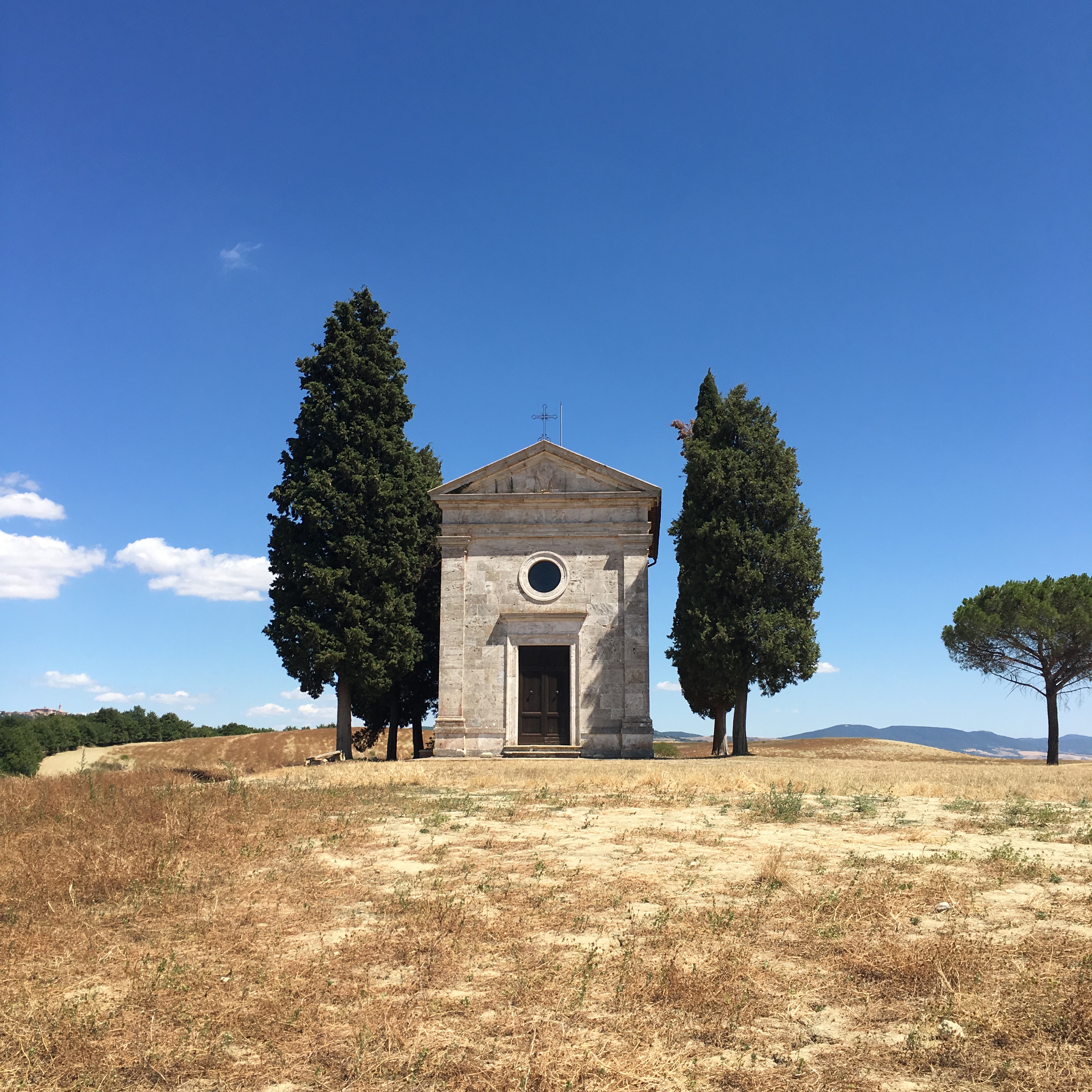 Regal cypress trees bookending the modest chapel