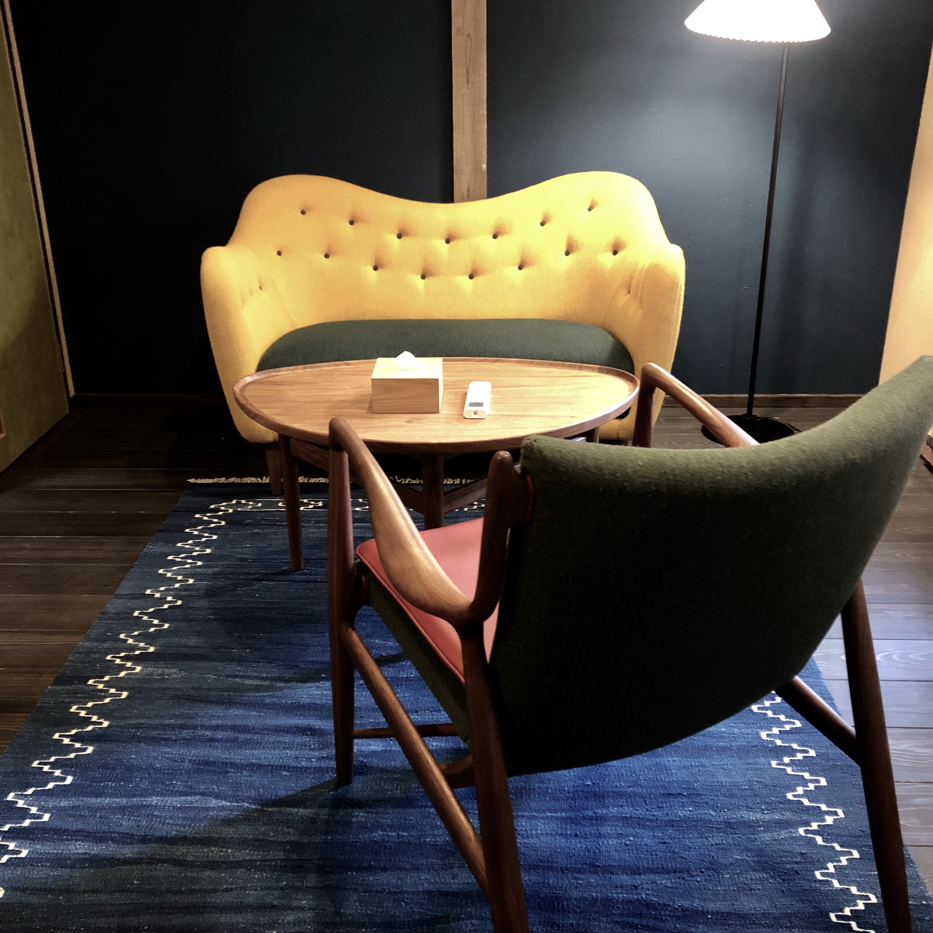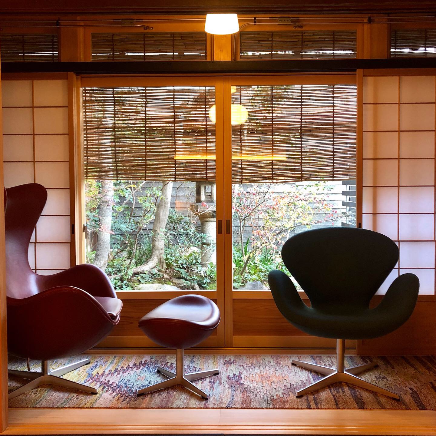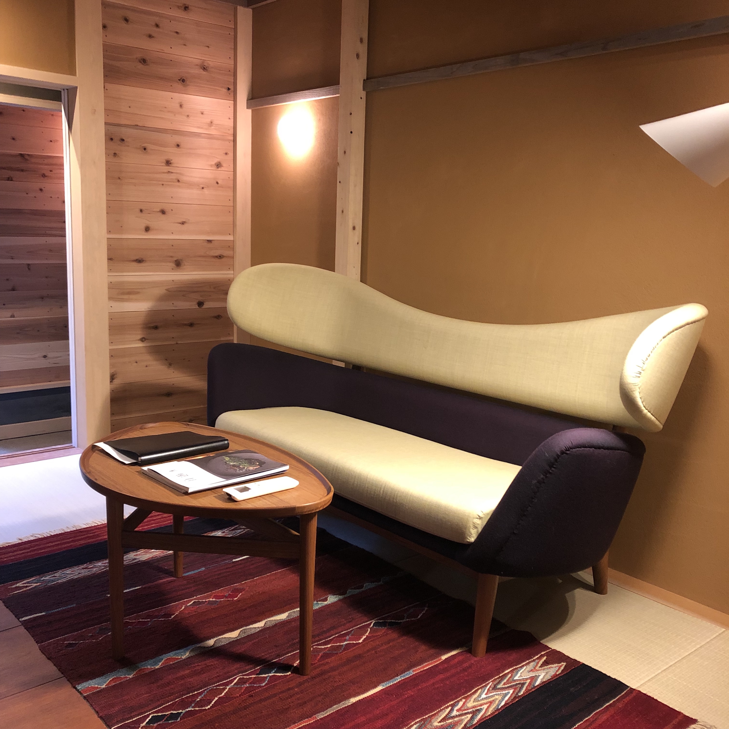 As I entered Chaya (a split-level private villa configuration), there it was Finn Juhl Pelican Chair, arguably the most avant garde product of the designer perching on the living room tatami floor. Genuinely surprising was how the elaborate and voluminous Pelican chair harmoniously exists in this confined and delicate setting. It wasn’t the contrast that was strangely pleasing, indeed it was how the Japanese and Finnish dimensions naturally fit.